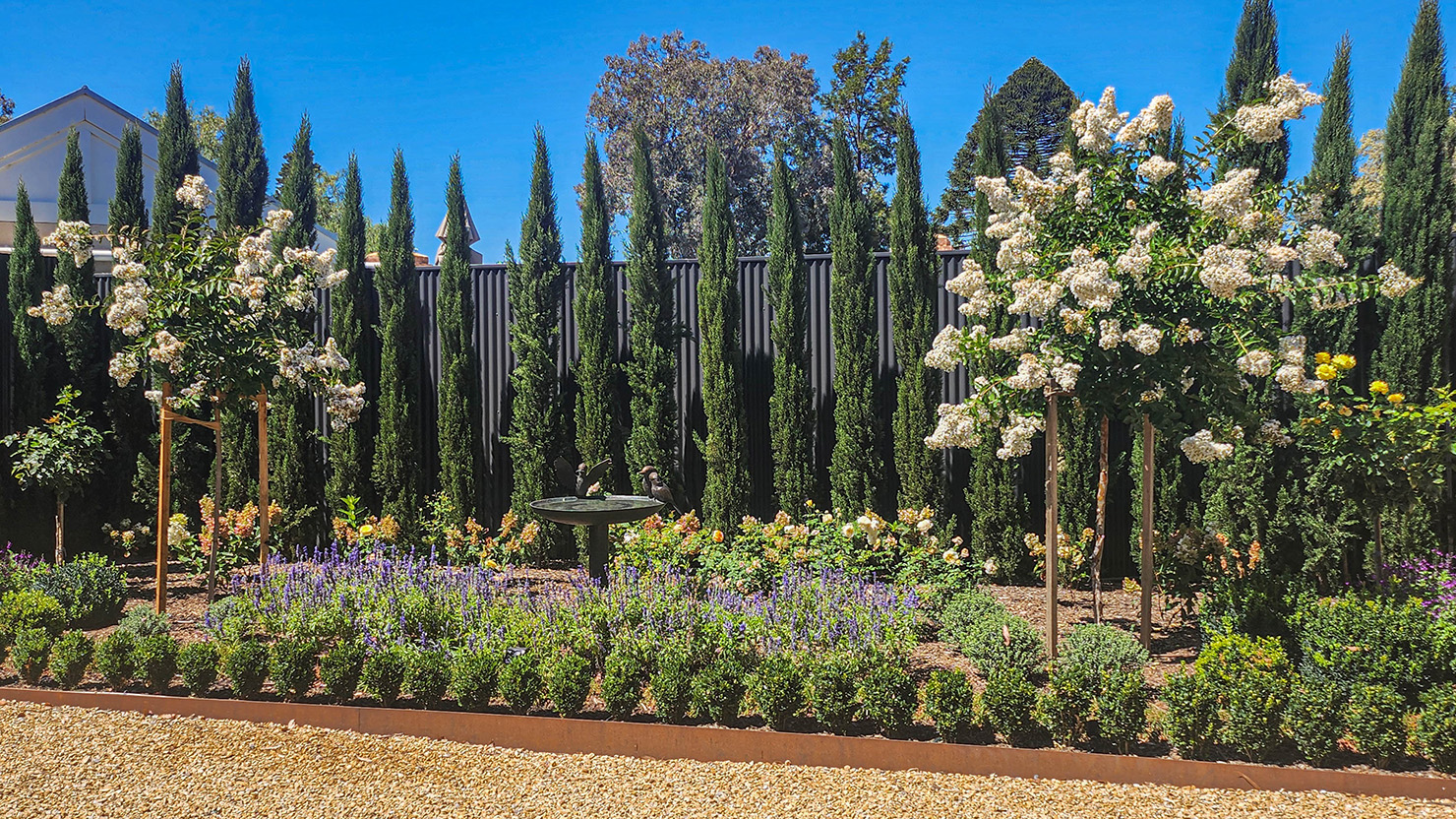 Tucked away at the end of a long, hedge-lined drive is Luna’s Garden, named for the fine life-sized bronze statue of Luna, a joyful, pony-tailed young girl who appears to be playing in the garden. The drive opens to a gravel courtyard flanked by box-edged, flower-filled garden beds, providing a hint of what lies beyond!